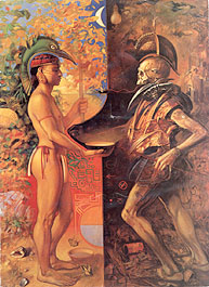 At the Museum of the City, in a stairwell hang a series of three paintings by the contemporary Quiteño painter, Jaime Zapata. They're remarkable, depicting scenes of the Conquest. The middle one shows the arrival of the Spanish. It's divided down the middle, with the Indian world on the left, and the Spanish/European on the right. A line bisects the two worlds, except in the middle where it bulges as the conquistador reaches through with pincer-like digits to grab the Indian's necklace. At the Spaniard's feet, rubbish and debris lie strewn, while on his arm there's a watch, and atop his helmet a crucifix. The top part of his face is skeletal, his jaw a steel plough, his armored body robotic. Greys and browns wash over his side of the painting, while on the Indian's, colors sing. I've found few more poignant artistic representations of the Conquest.