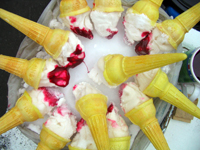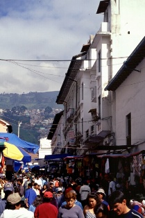 Until recently, Franciscan, colonial Quito lived on. The Saturday street market would teem like a trout farm. Stalls clogged either side of the chessboard-grid of thoroughfares. Their blue awnings virtually webbed the narrow streets, knitted with cords and ropes to hold them up, trip one up, or garrote you. One couldn't move in some parts. And through this fish farm of commerce swam more traders, ambulant ones with their wares on trolleys, or in crates dragged by fraying string. Women carried platters of pink-iced cakes, big chisel-jawed black men sold fruit punches on boxes, vendors hawked Popsicles, boiling tripe in buns, vegetables, alarm clocks, fruit, and more socks and gloves and scarves than I've ever seen.